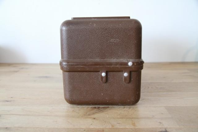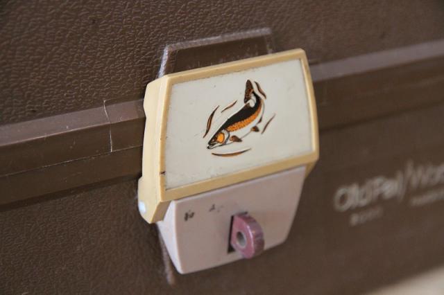 味わい深いブラウンカラーのプラスチック製ボディと、蓋のロック部分にあしらわれた躍動感のある魚のイラストが、時代を超えた魅力を放っています。