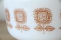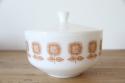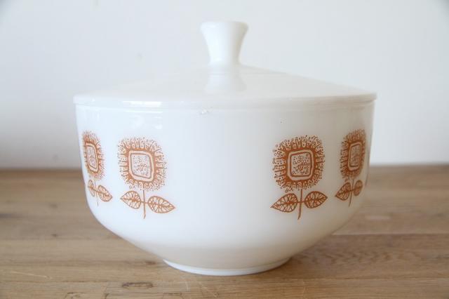 アメリカを代表するガラスメーカー、Federal Glass(フェデラルグラス)社製のミルクガラス・キャセロールです。 パッと目を引くオレンジの「ひまわり(サンフラワー)」のような抽象的なフラワーデザインが、キッチンや食卓にレトロで明るい彩りを添えてくれます。