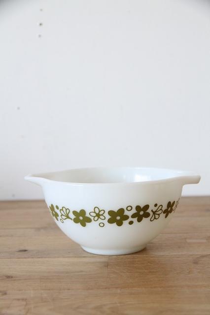 アメリカの家庭で長く愛されてきた、オールドパイレックス(Old Pyrex)のアイコン的なモデル、「スプリングブロッサム・グリーン(通称:クレイジーデイジー)」のシンデレラミキシングボウルです。