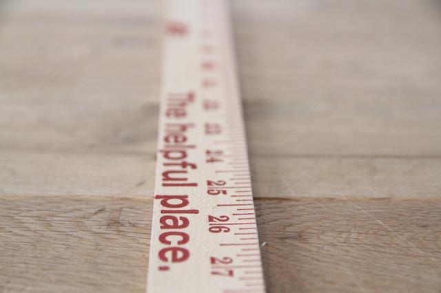 一般的なヤード棒(36インチ/約91.4cm)よりも長く、目盛りが36インチを超えて刻まれている大変珍しいロングタイプです。実用性はもちろん、使い込まれたような木の風合いと「The helpful place.」の赤いロゴデザインが非常にオシャレで、インテリアとしても映える一品です。