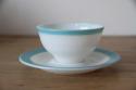 透き通るような白のミルクガラスに、鮮やかなターコイズブルーのラインが縁取られた非常に爽やかなデザイン。1950年代〜60年代頃に製造された、古き良きアメリカを感じさせる一客です。