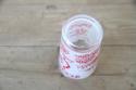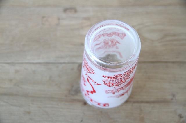 ミルクガラスのような柔らかな透け感のあるフロスト(艶消し)加工が施されており、赤いプリントがレトロで温かみのある雰囲気を醸し出しています。