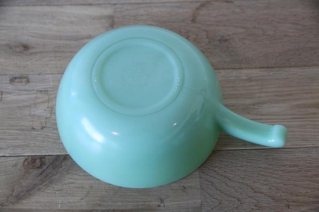 Fire-King(ファイヤーキング)を象徴するジェダイカラーの片手ポット(ソースパン)です。注ぎ口とハンドルが付いた使い勝手の良い形状で、ミルクパンやソース作り、またボウルとしてもマルチに活躍します。