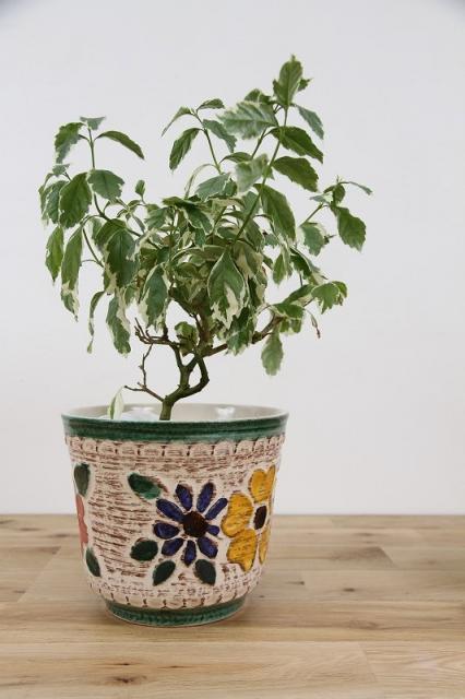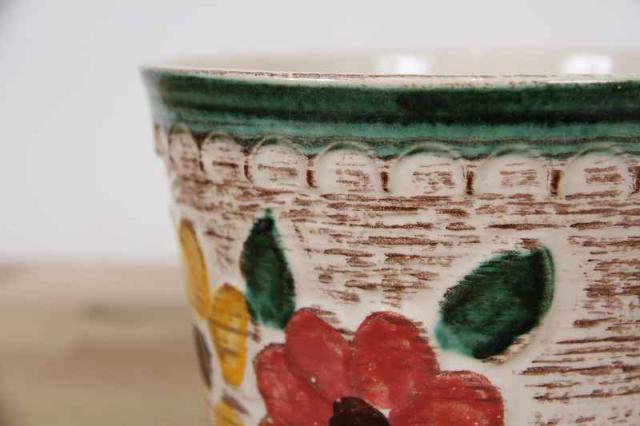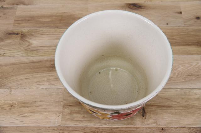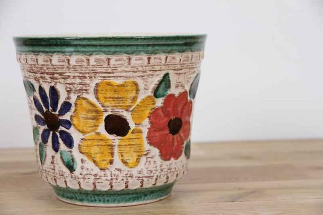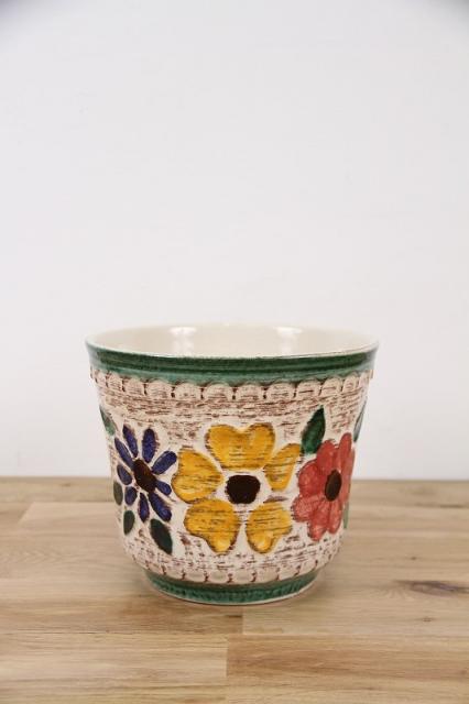 ドイツ製ヴィンテージの陶器製フラワーポットです。おそらく1950~70年代製のものと思われます。全体的に大きくデザインされたレトロなお花模様がお部屋を一気に明るくしてくれそうです。陶器製の鉢カバーの中では、大きめで珍しいサイズです。