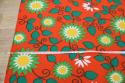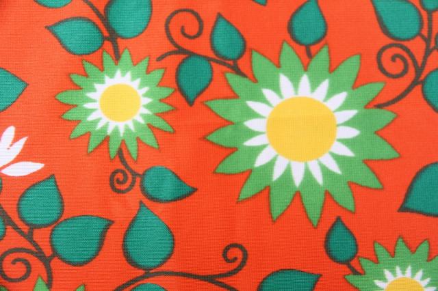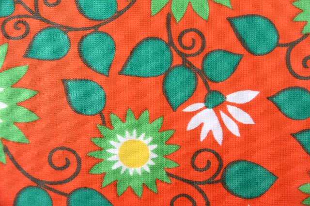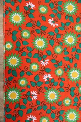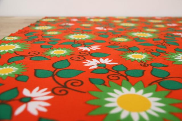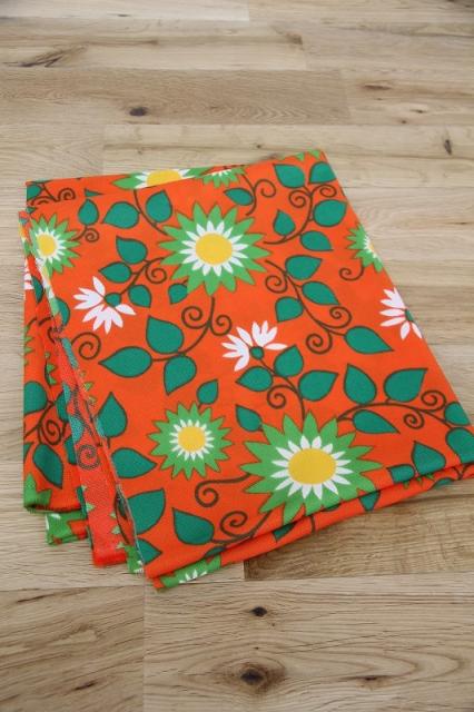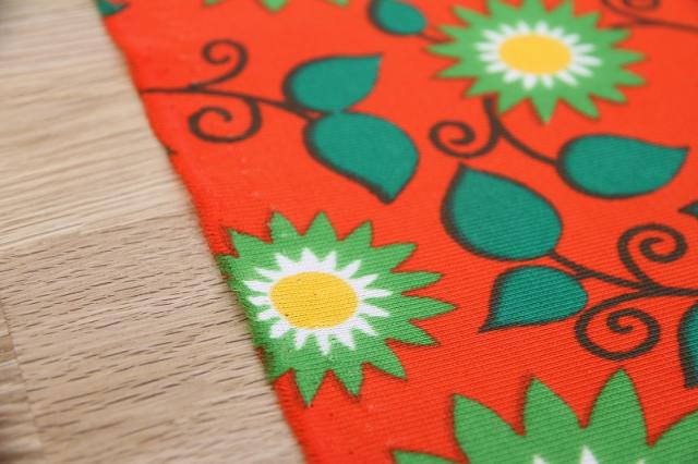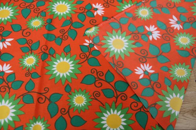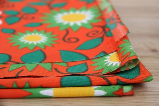 太陽のような賑やかなフラワープリントが素敵なヴィンテージファブリック。オランダで見つかったものです。ジャージ素材のような、伸びやすい質感です。ブラッドオレンジのような色にグリーンの配色がなんとも賑やかで明るい気持ちにさせてくれるデザインです。