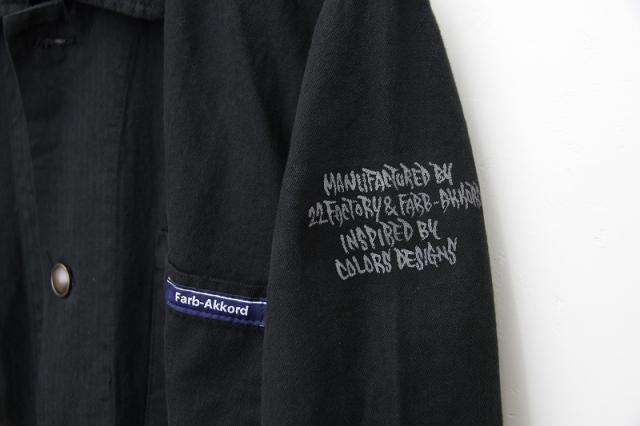 Farb-Akkordオリジナルのワークコートです。チェコ軍のコートをモデリングしたシルエットになっています。左肩にはCOLORS Designsの職人ペインターが一枚一枚描いたハンドペイント入り。カジュアルなデザインで、ワークコートならではの羽織った時の動きやすさが特徴です。サイドにスリットを入れることでワイドパンツはもちろん、女性ならスカートと組み合わせてもかさばりにくい仕様に。レディース、メンズM/Lの3サイズ展開です。