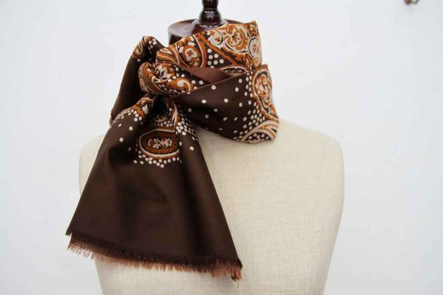 ヨーロッパから届いた長方形型のヴィンテージスカーフです。ブラウンベースの色合いで秋冬のファッションには持ってこい!なデザインです。レトロファッションを楽しみましょう。