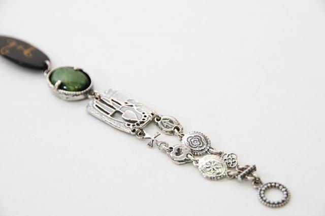 唯一無二の特別感を味わえる、Gem Kingdomのブレスレットです。グリーンタイガーアイのひとつひとつ色柄の出方の違うモチーフと、ブラックホーンのデザインがアクセントになります。
