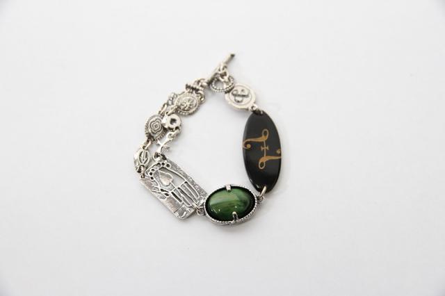 唯一無二の特別感を味わえる、Gem Kingdomのブレスレットです。グリーンタイガーアイのひとつひとつ色柄の出方の違うモチーフと、ブラックホーンのデザインがアクセントになります。