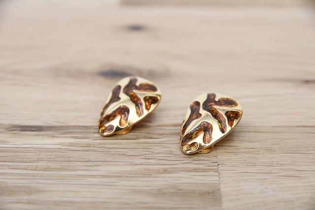 アメリカ製、モダンな茶色の模様が入ったティアドロップ型のヴィンテージイヤリングです。ミリタリーなファッションがお好きな方にもおすすめ♪