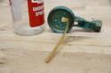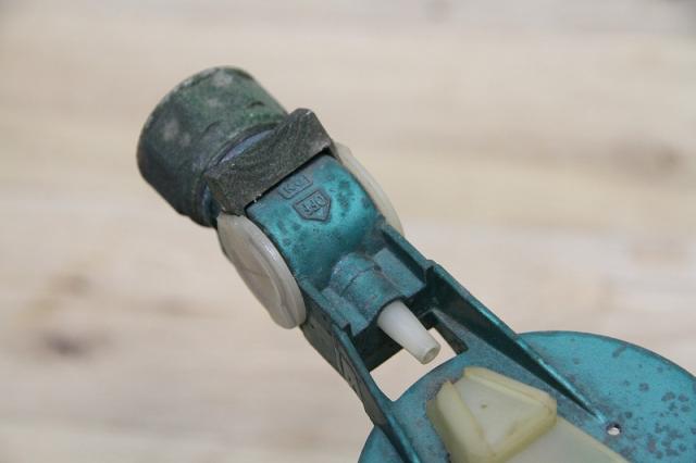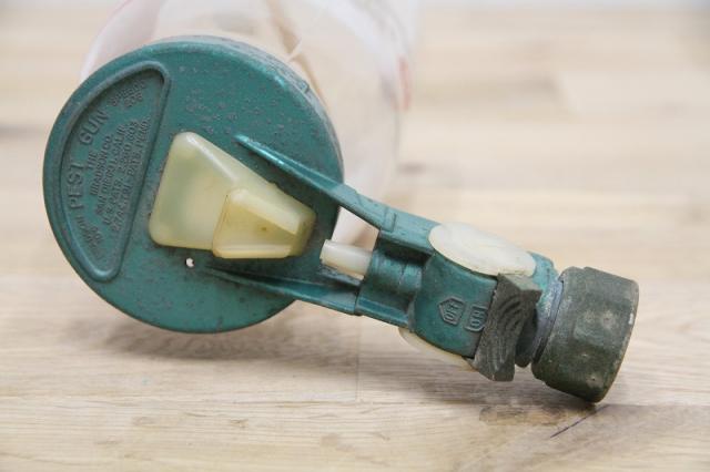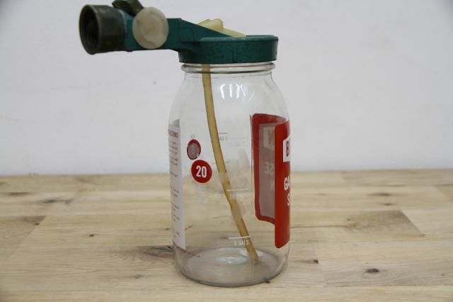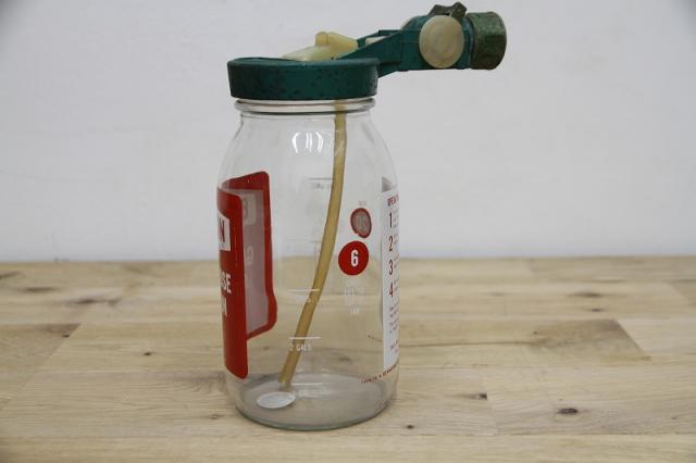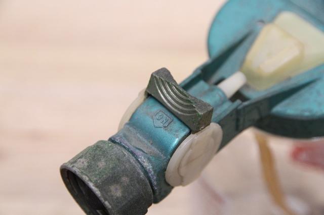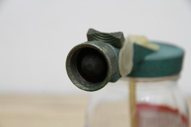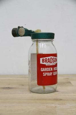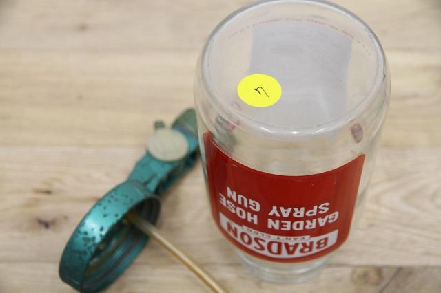 アメリカの「BRADSON COMPANY」社製の、ヴィンテージ・ガーデンホーススプレーガンです。ガーデンホースに取り付け、液体の肥料や殺虫剤などを水に希釈して散布するために使用されていた、実用的なアンティーク品。レトロなデザインと、ボトルのラベルの赤と緑のコントラストが、目を引く逸品です。