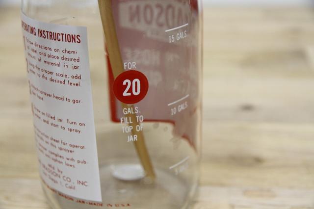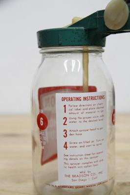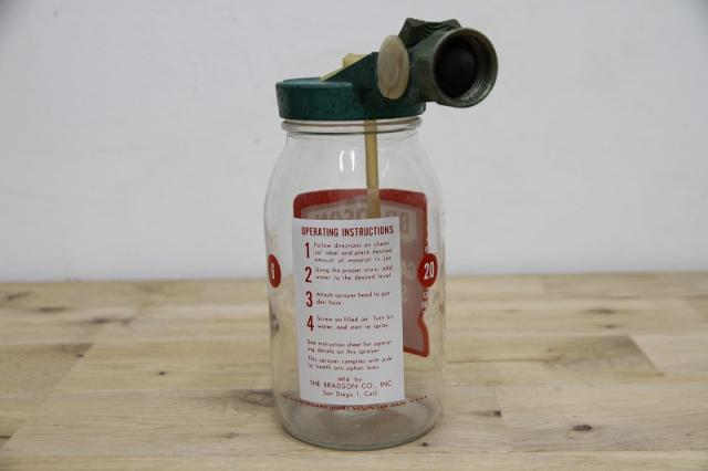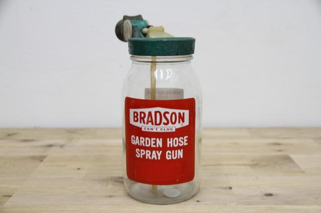 ヴィンテージ感あふれるデザイン: クリアなガラスボトルに、クラシックなフォントで印字された「BRADSON GARDEN HOSE SPRAY GUN」のラベルが、お庭やインテリアにノスタルジックな雰囲気をプラスします。