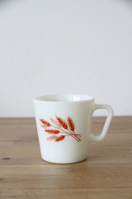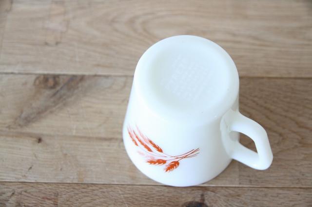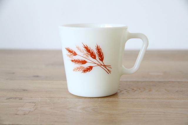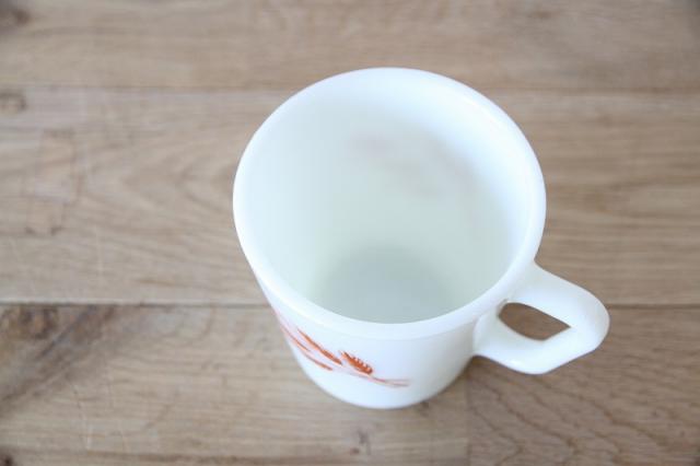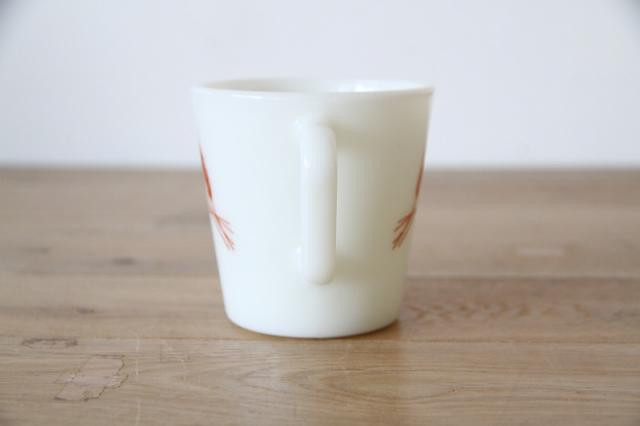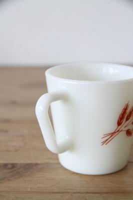 白濁したミルクガラスによく映える、温かく素朴なデザインです。フォルムダイアゴナルハンドル(Dハンドル/スクエアハンドル)持ち手が角ばっており、Pyrexのミルクガラスマグの定番の形です。