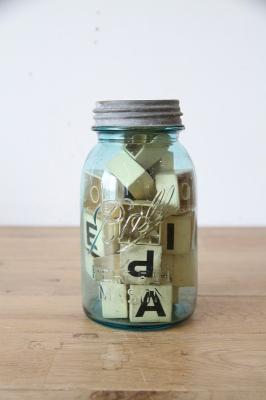 ヴィンテージ Ball社製メイソンジャーと、その中に詰められたレトロなアルファベットブロックのセットです。
