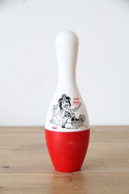 ボウリングのピンの形をしており、赤と白のプラスチック製で、海賊のキャラクター「Jolly Wally」が描かれています。