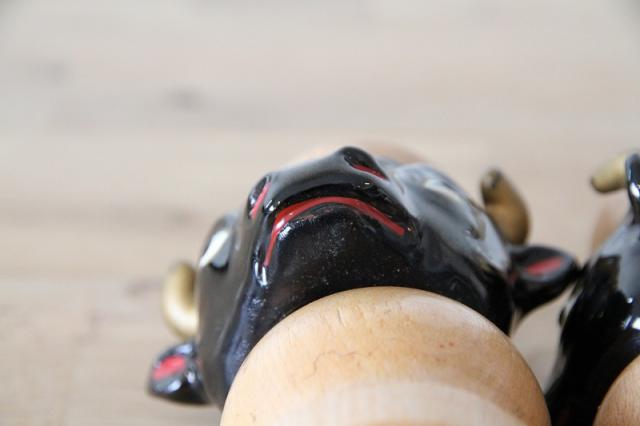 艶やかなブラックセラミックで表現された牛のヘッドと、温かみのある天然木を組み合わせた、非常に珍しいヴィンテージの調味料入れセットです。