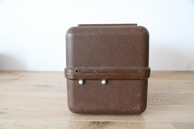 味わい深いブラウンカラーのプラスチック製ボディと、蓋のロック部分にあしらわれた躍動感のある魚のイラストが、時代を超えた魅力を放っています。