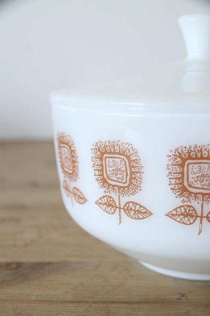 アメリカを代表するガラスメーカー、Federal Glass(フェデラルグラス)社製のミルクガラス・キャセロールです。 パッと目を引くオレンジの「ひまわり(サンフラワー)」のような抽象的なフラワーデザインが、キッチンや食卓にレトロで明るい彩りを添えてくれます。