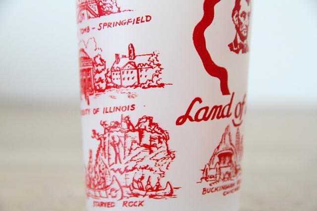 アメリカ・イリノイ州の歴史と観光名所が描かれた、ヴィンテージ・スーベニアグラスです。