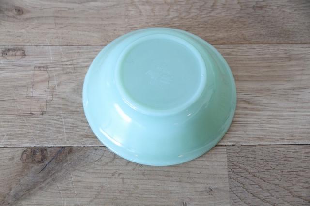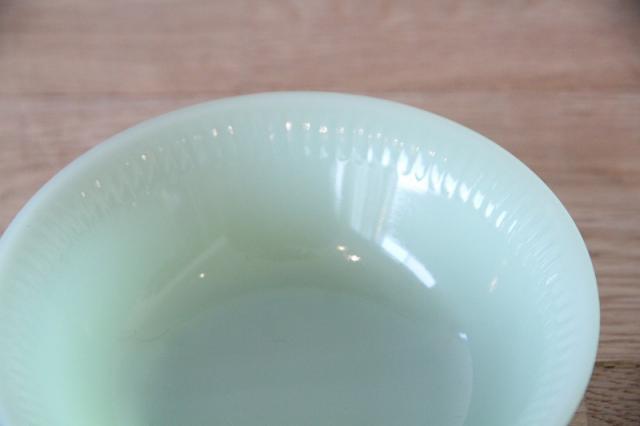 ヴィンテージ・アメリカンキッチンの象徴「ジェダイ」 1940〜60年代にかけて、アンカーホッキング社で製造されたファイヤーキングを代表するカラー「ジェダイ(翡翠色)」。ミルクガラス特有の柔らかな透け感と、独特の温かみのある緑色が、食卓を優しく彩ります。
