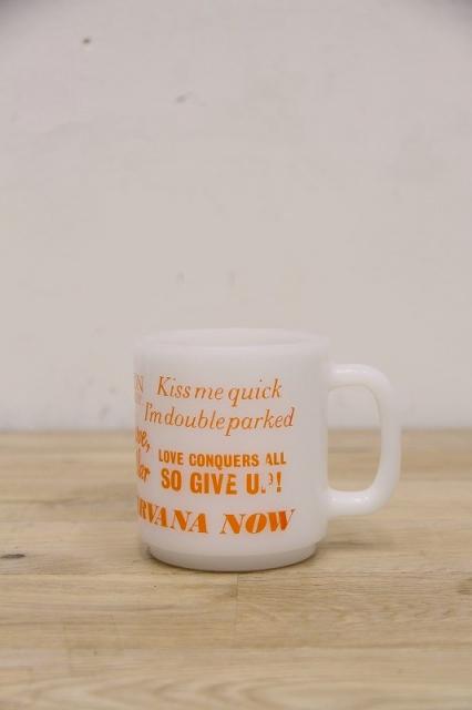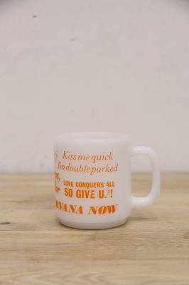 1917年に創業された耐熱ガラスブランドGLASBAKE。様々な企業とのコラボマグカップを製造してました。Make Love Not Warとヒッピースローガンがプリントされています。